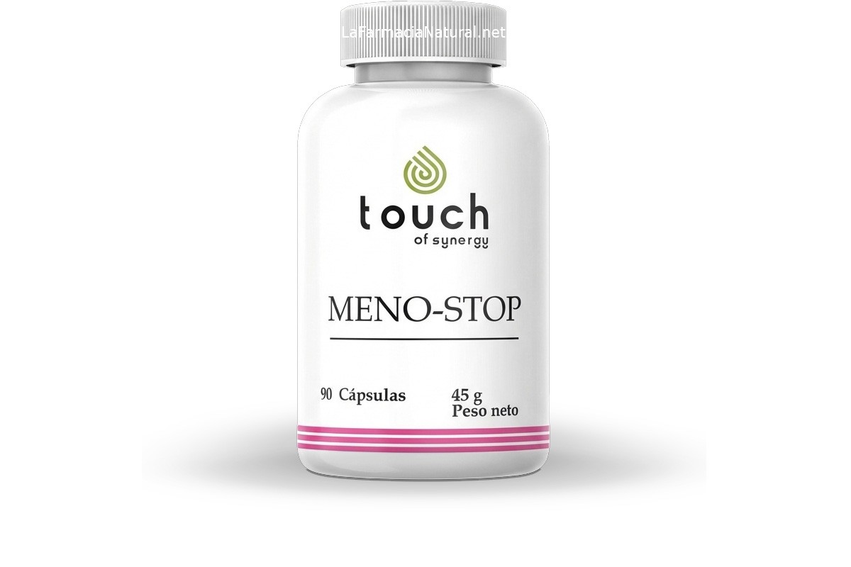 Descubre Meno-Stop, un suplemento nutricional en cápsulas con isoflavonas de soya, trébol rojo, ashwagandha, melissa, valeriana, vitamina D y K2, diseñado para mujeres en etapas de cambio hormonal.