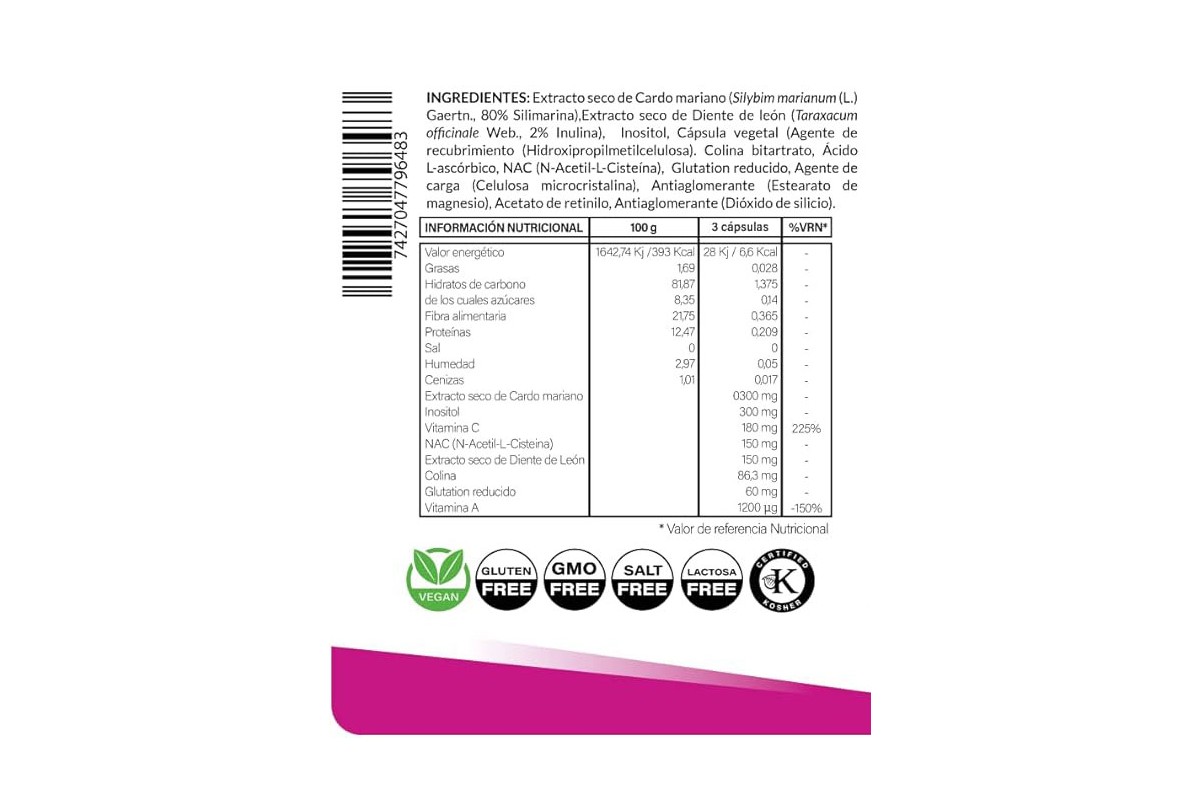 El Cardo Mariano de ToS, proporciona 300 mg de extracto de semilla de Cardo Mariano por porcion de 3 capsulas, estandarizado al 80% de silimarina, que trabaja en sinergia con los componentes adicionales.