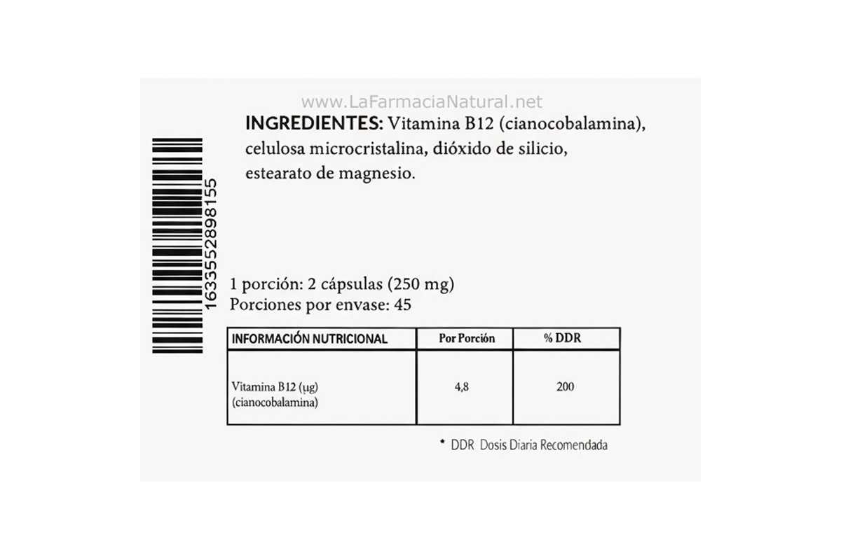 Vitamina B12, apoya al sistema inmunológico, nervioso y cerebral. La Vitamina B12 es especialmente necesaria para los vegetarianos y todos los que consuman principalmente alimentos cocidos o procesados. Cada cápsulas contiene el 100% de B12 recomendada.