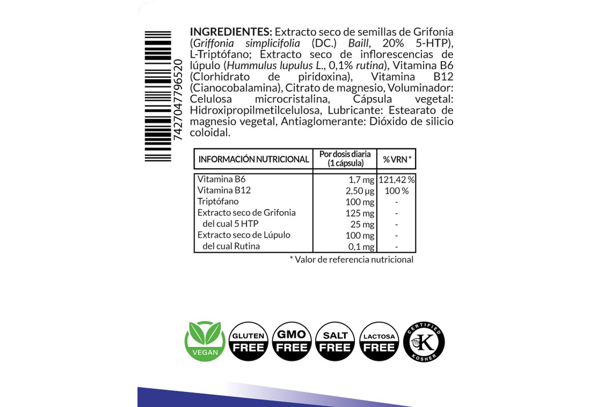 Complemento alimenticio a base de 5-HTP proveniente de grifonia, rutina proveniente de lúpulo, L-triptófano, vitaminas B6 y B12.